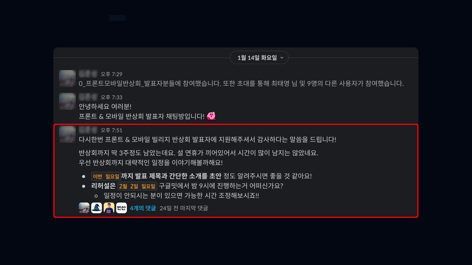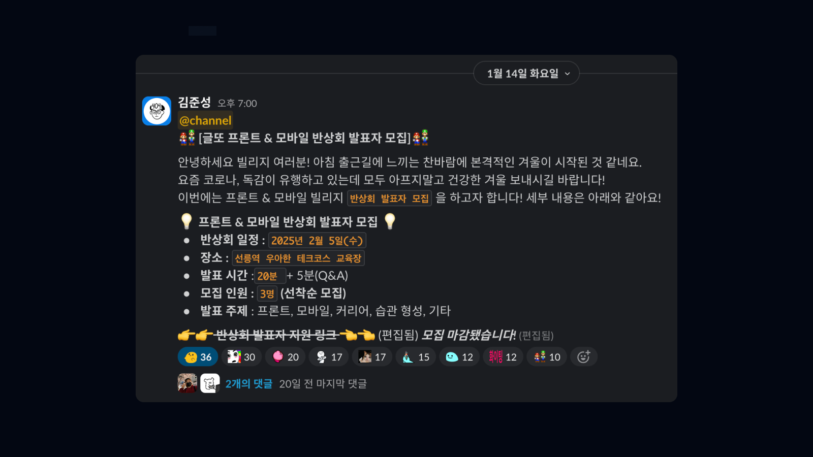 의 슬랙에서 프론트엔드 반상회의 발표자를 모집한다는 글이 올라온 것입니다!! 천만 다행인 것은... 사실 저는 슬랙 푸시를 잘 체크하지 못해 번번히 소식 업데이트가 늦어졌었는데… 마침 이때는 기가 막히게 푸시가 오자마자 확인했다는 것이죠!