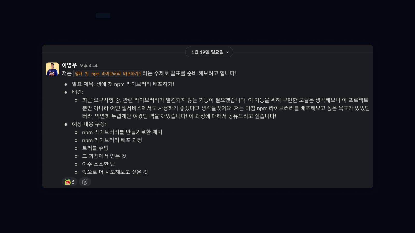 고민 끝에 최근 "npm 라이브러리를 처음으로 만들어본 경험"에 대해서 발표를 만들어보자고 결심했습니다!