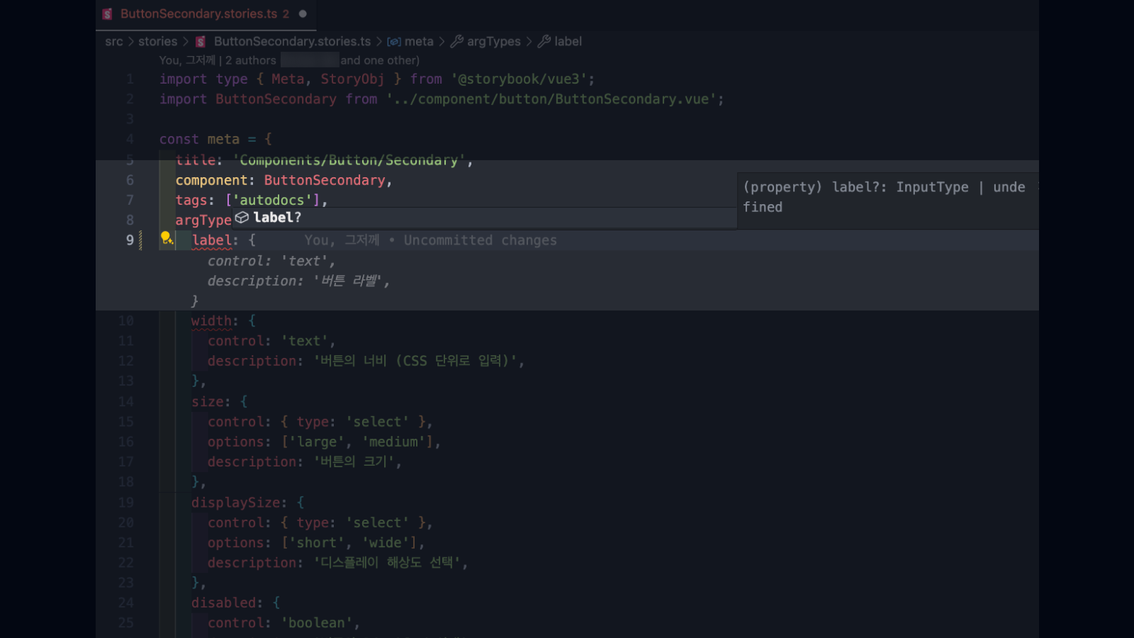 결과적으로는 샘플로 구성되어있는 스토리에서 확인했듯, 1 컴포넌트 1 스토리를 만들어야 하는 것이었어요. 그럼 2번 작업하는 셈이기 때문에 비용이 큰 것이 아닐까 싶었지만, 다행히도 기존에 만든 컴포넌트를 import하면 컴포넌트의 props가 자동완성으로 연결되어 작성하기 수월한 구조였습니다!