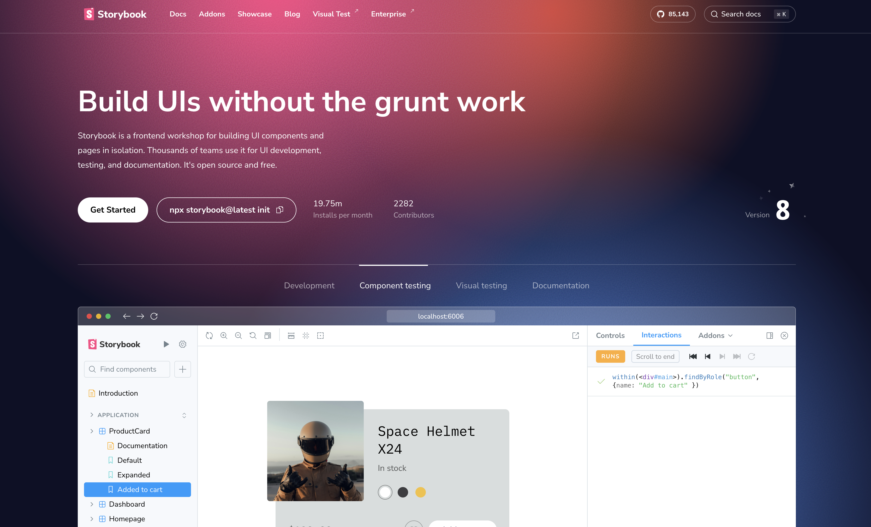 Storybook은 UI 구성 요소와 페이지를 격리하여 빌드하기 위한 프런트엔드 워크숍입니다. 전체 앱을 실행할 필요 없이 도달하기 어려운 상태와 엣지 케이스를 개발하고 공유하는 데 도움이 됩니다. 수천 개의 팀이 UI 개발, 테스트 및 문서화에 이를 사용합니다. 오픈 소스이며 무료입니다.