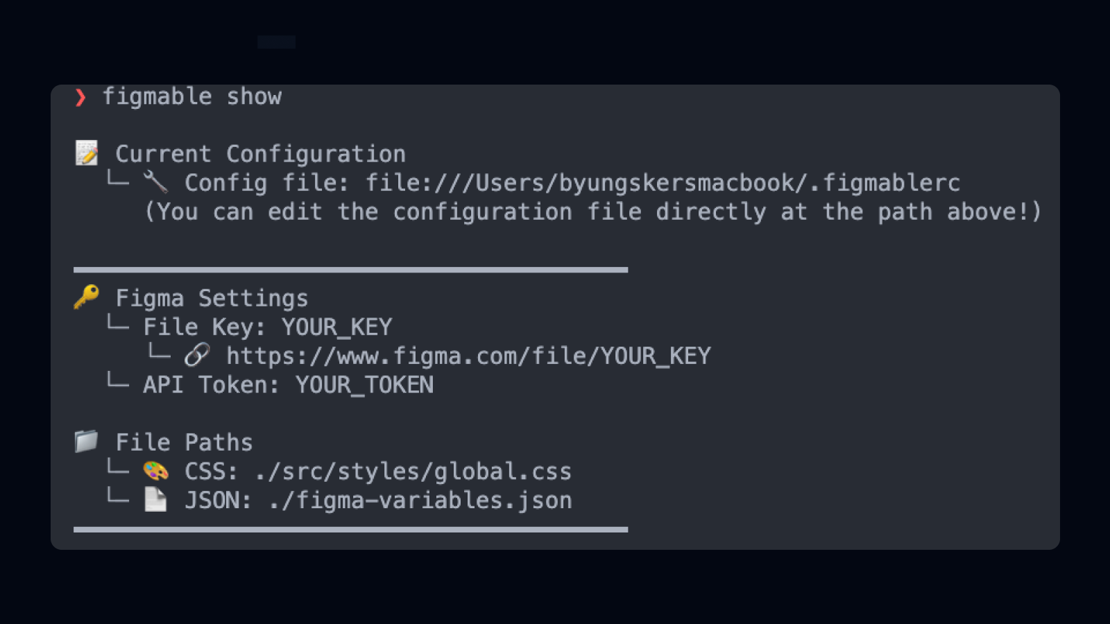 ❯ figmable config --fileKey YOUR_KEY --token YOUR_TOKEN --path ./src/styles/global.css