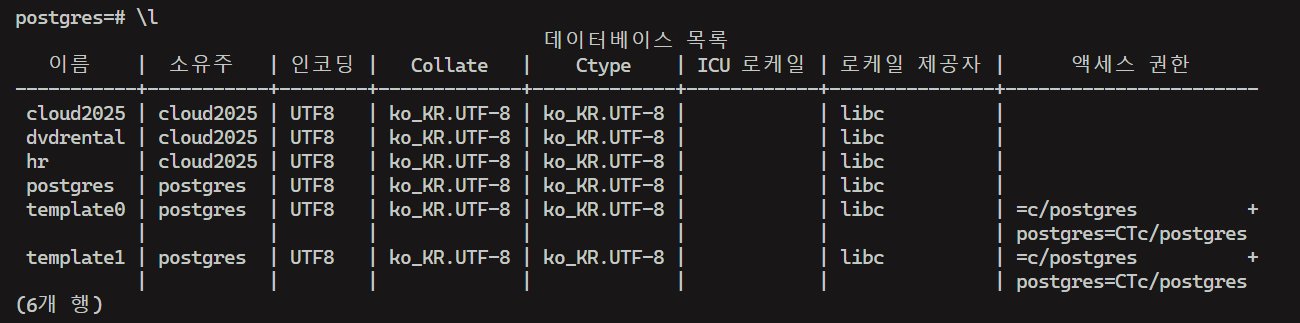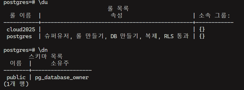 | 테이블/뷰 | \dt, \dv, \d, \d+ |