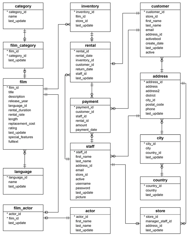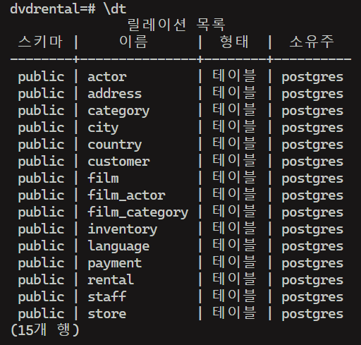 dvdrental 데이터베이스는 DVD 대여 상점의 비즈니스 프로세스를 표현한 것