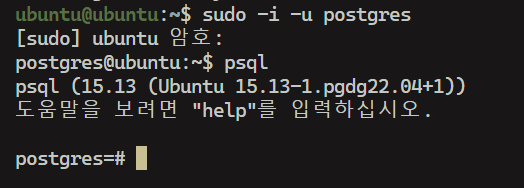 | 항목 | sudo -i -u postgres | sudo -u postgres psql postgres |