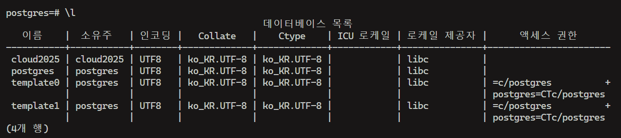 | 접속 대상 DB | 없음 (셸만 바뀜) | postgres DB로 바로 접속 |