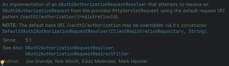 이 인터페이스를 구현한 클래스들은 HttpServletRequest에서 OAuth2AuthorizationRequest 객체를 생성할 수 있다. 기본적으로 DefaultOAuth2AuthorizationRequestResolver 구현체가 사용된다.