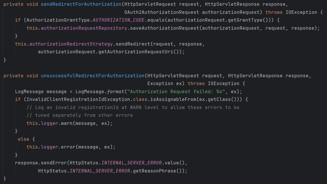 OAuth2AuthorizationRequestRedirectFilter는 파라미터로 받은 OAuth2AuthorizationRequest의 Grant Type이 지정된 타입과 일치하면, 이를 AuthorizationRequestRepository에 저장한 후 OAuth2AuthorizationRequest가 가진 AuthorizationRequestUri로 리다이렉트 요청을 보낸다.