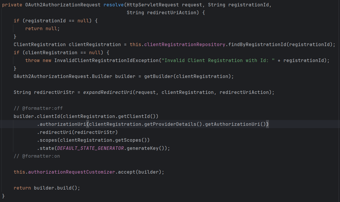 이 필터에서는 OAuth2AuthorizationRequestResolver의 resolve 메서드를 호출해, 받은 HttpSerevletRequest에서 OAuth2AuthorizationRequest 객체를 생성하여 반환한다.