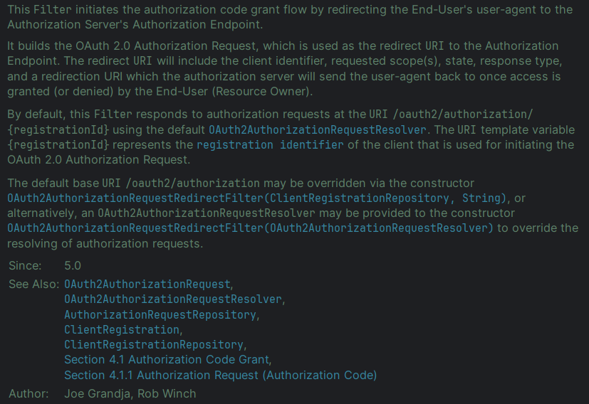 OAuth2AuthorizationRequestRedirectFilter 필터는 사용자의 브라우저를 Authorization server의 인증 엔드포인트에 리다이렉트하는 것으로 authorization code grant 프로세스를 초기화한다. 엔드포인트로의 redirect uri로 사용되는 OAuth 2.0 Authorization request를 빌드하는데, 이 request는 클라이언트 id, scope, state, response type, 그리고 인증이 성공했(거나 실패했)을 때 사용자를 리다이렉트할 redirection uri를 포함하고 있다.