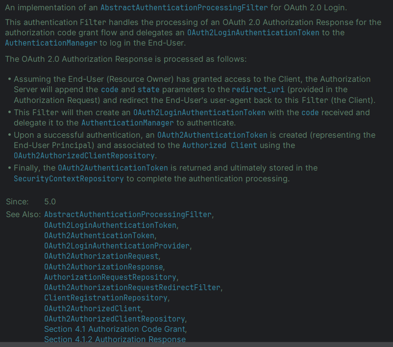 OAuth2LoginAuthenticationFilter는 authorization code grant 플로우에서 OAuth2Authorization 응답을 처리하고 OAuth2LoginAuthenticationToken을 AuthenticationManager에 위임하여 사용자를 로그인하는 과정을 담당한다.