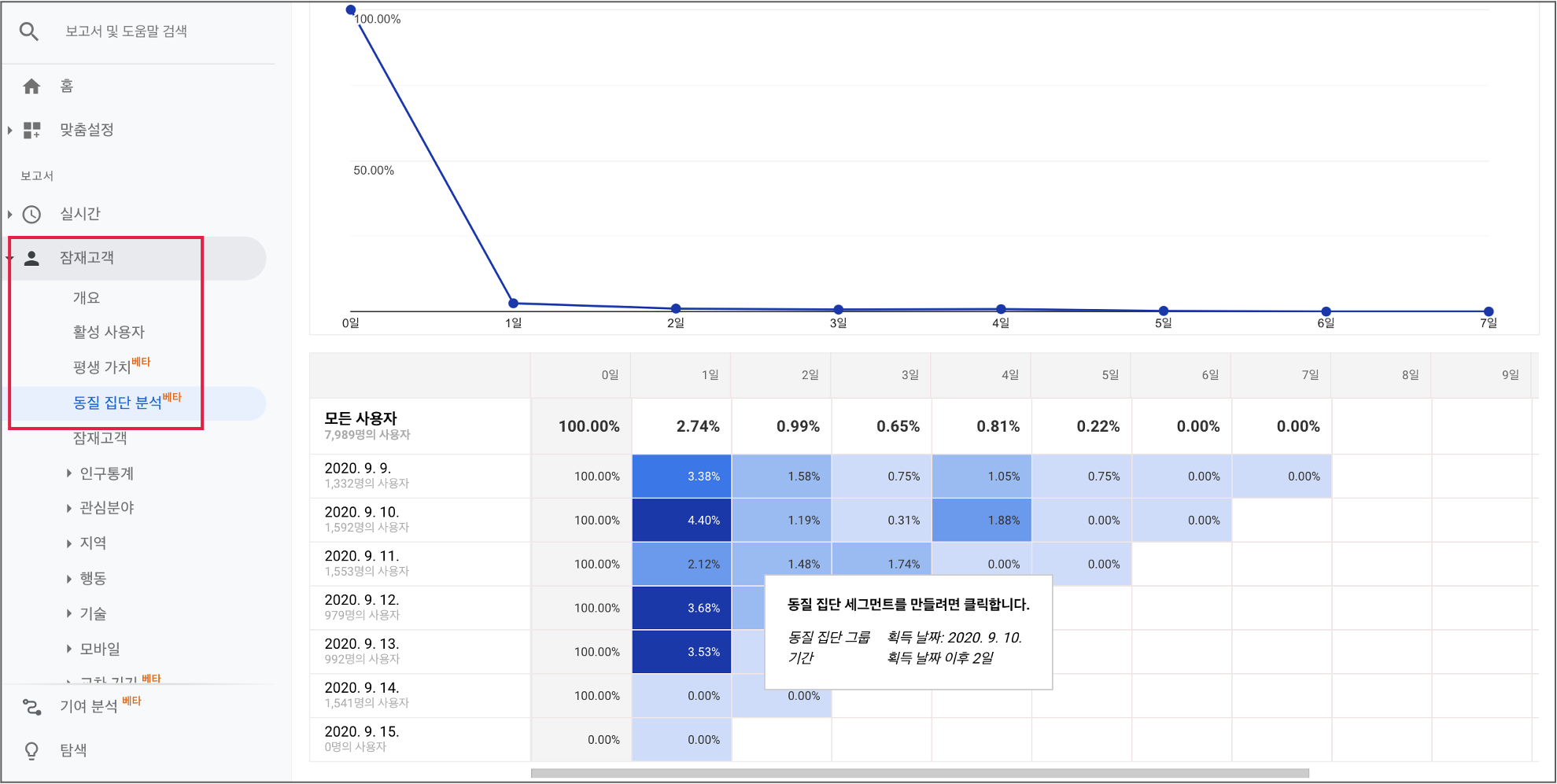 - 행동 기반이나 유입 경로 기반의 코호트를 생성하여 각 그룹의 고유한 패턴을 파악.