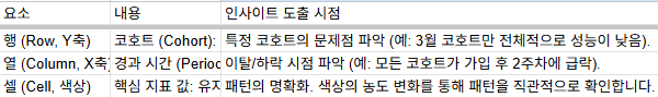 - 특정 시기에 유입된 그룹(코호트)이 시간이 지남에 따라 얼마나 남아있는지(유지율)를 정확히 보여줌.
