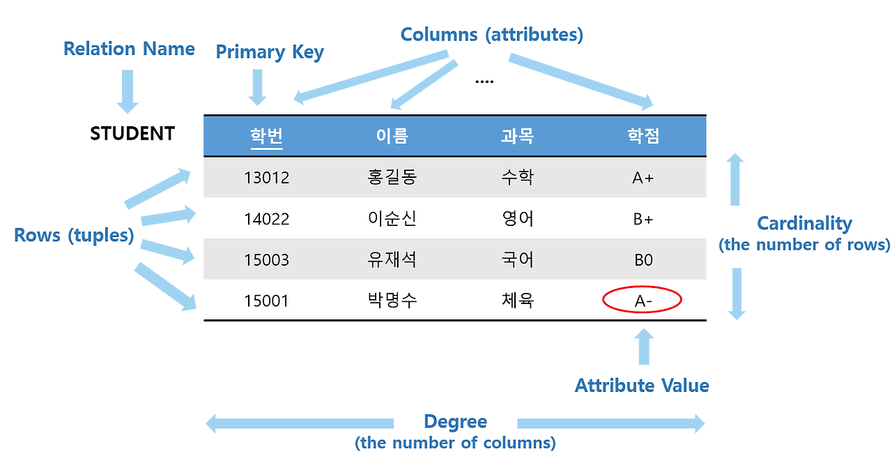 : 테이블 형식(2차원 구조)을 이용하여, 데이터를 정의하고 설명하는 데이터 모델.