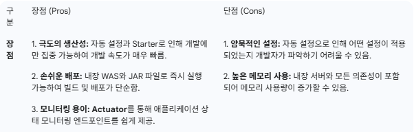 - 내장 WAS (Embedded Tomcat, Jetty)를 제공하여 JAR 파일로 독립 실행 및 배포 가능.