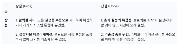 - 각 라이브러리와 버전을 '개별적으로 명시'하고 충돌을 수동으로 해결.