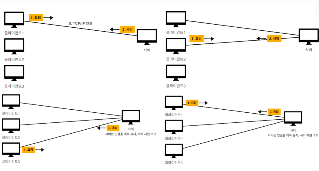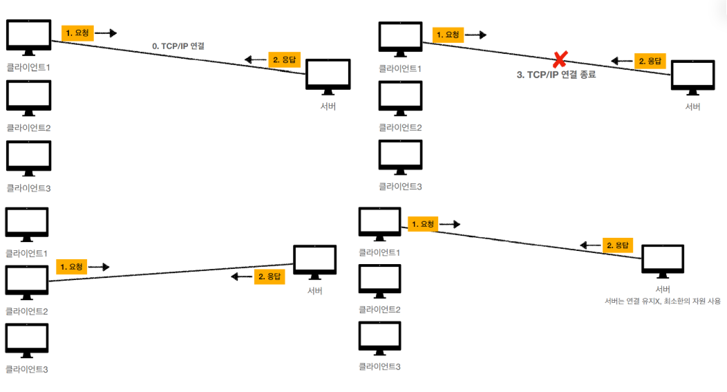 - 다만, 클라이언트가 연결을 계속 끊는 다는 것은 TCP/IP 연결을 매번 새롭게 맺어야 한다는 것을 뜻한다.