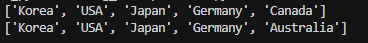 countries = ["Korea", "USA", "Japan", "Germany", "Canada"]