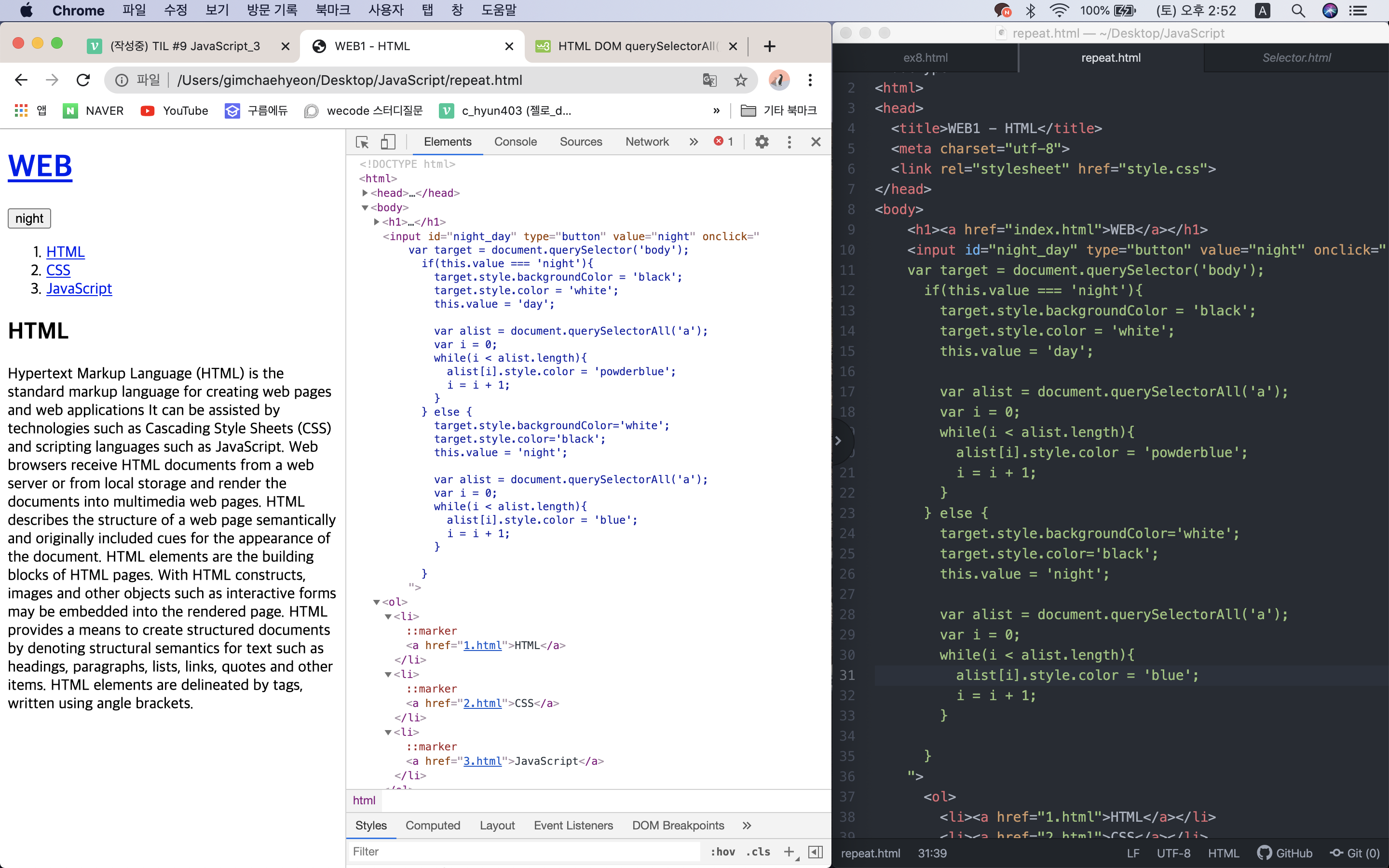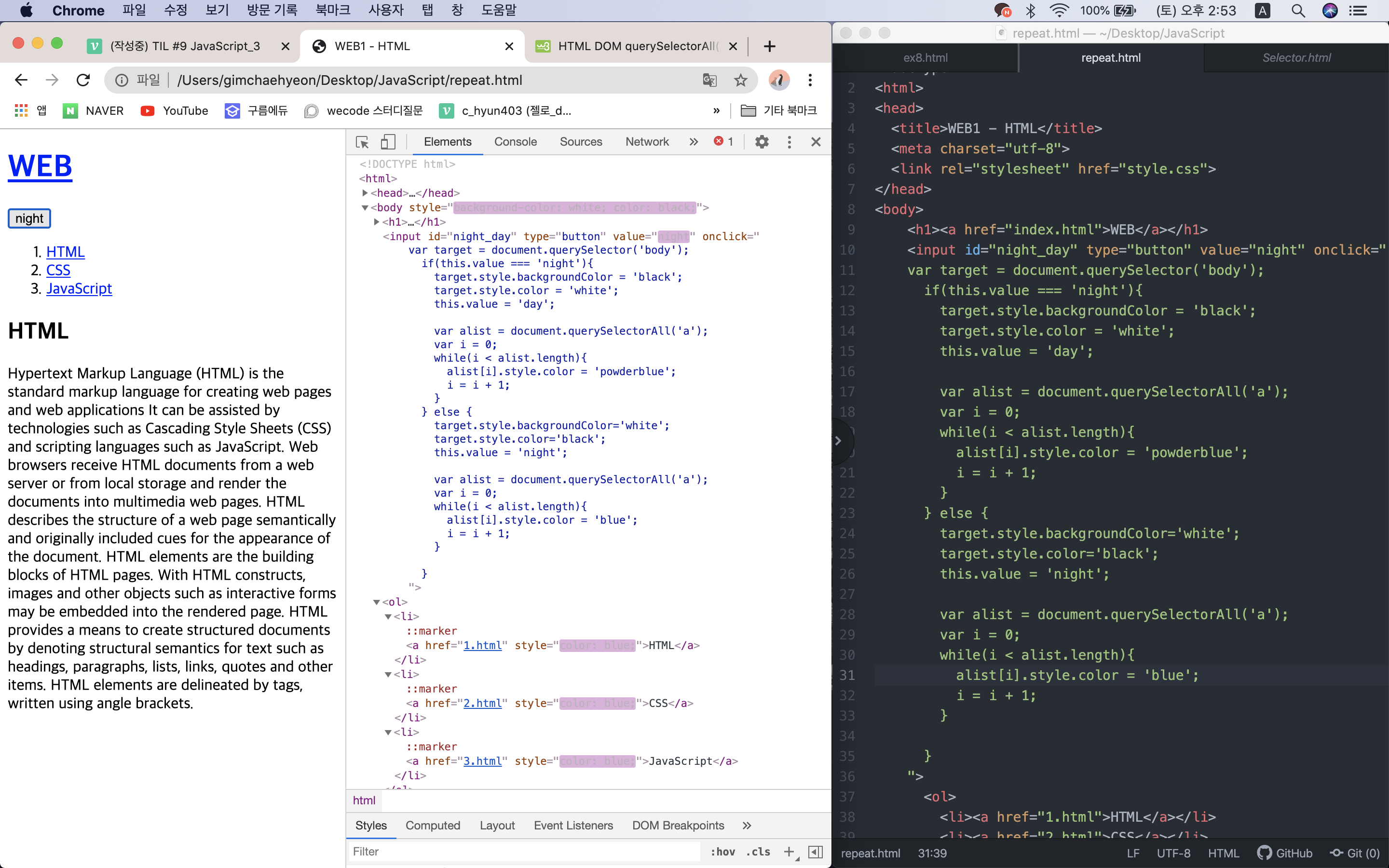 조건문 반복 내용에 대해 nightDayHandler라는 function으로 이름지어 주고, onclick으로 이를 출력하고자 nightHandler();라고 입력한 뒤 출력했을때