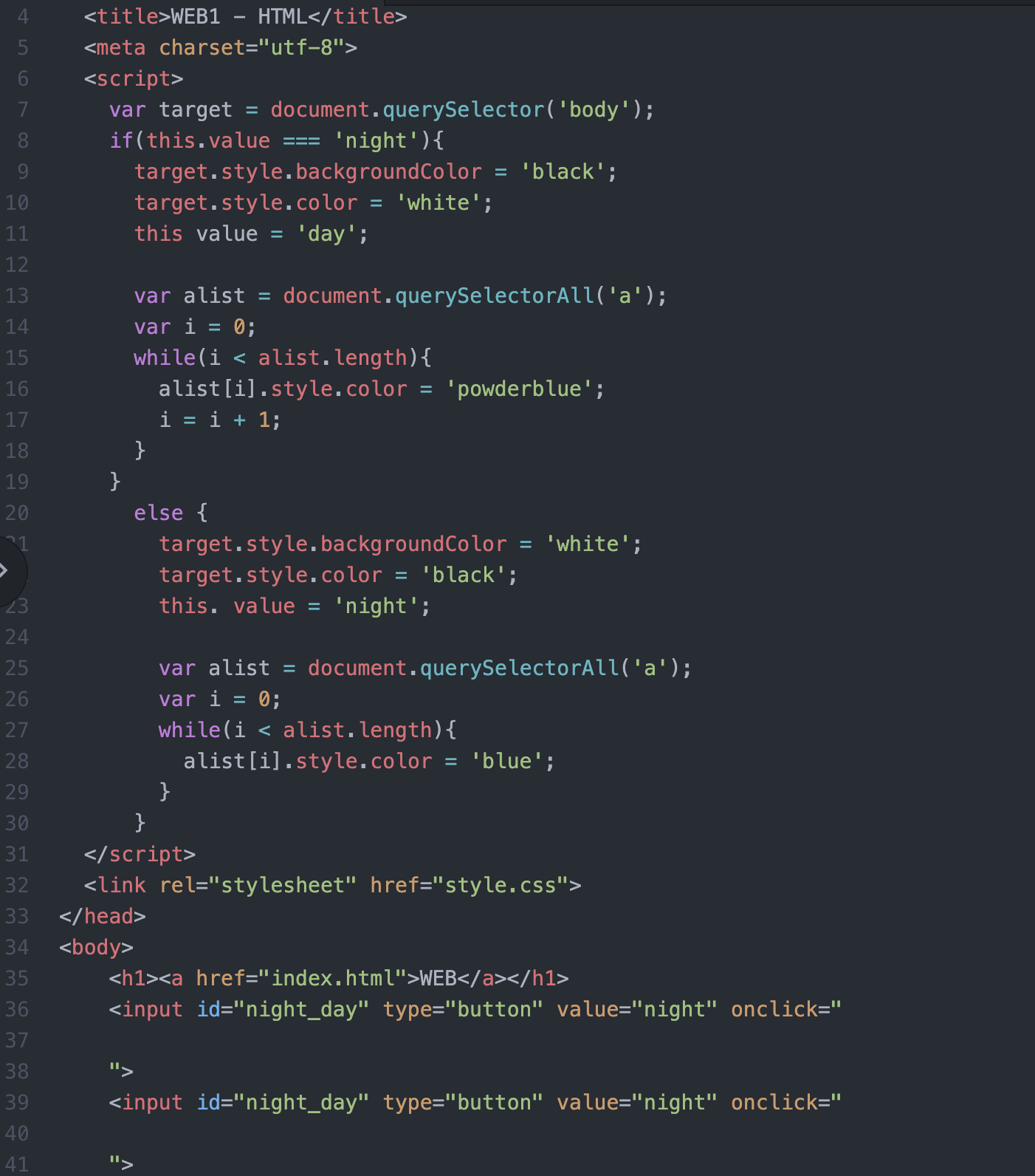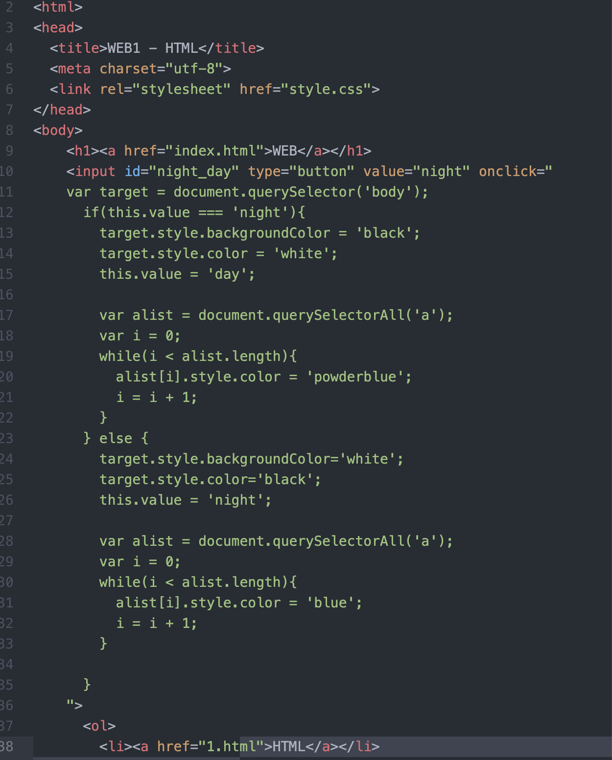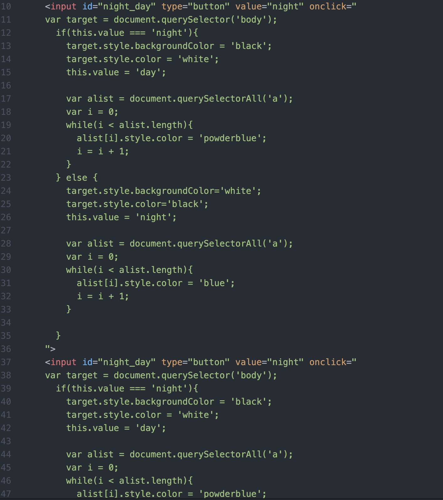 - alist의 length값보다 i 값이 작을 동안 night mode에선 하이퍼링크 색을 powderblue로, day mode에선 blue로 설정되게 한다. (모든 a 링크들이 계속해서 실행 됨 - alist.length 길이로 설정하였으므로 추후 a tag 가 추가된다 하여도 같이 적용됨! data가 바뀌어도 로직을 또 수정하지 않아도 됨)