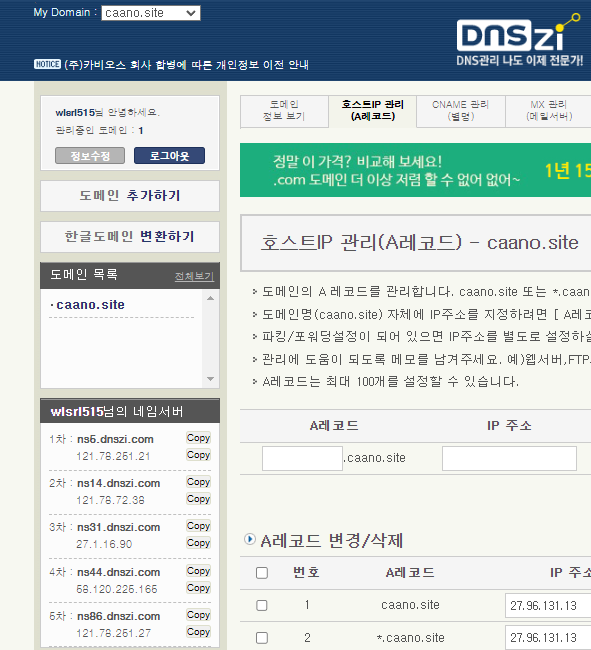 알고보니 어제 도메인을 구입한 후 dnszi 사이트를 통해 A레코드만 설정을 해주고 네임서버를 설정하지 않아서 생긴 문제였다. 그래서 dnszi 사이트에서 내 네임서버를 복사한 후 가비아를 통해 네임서버를 설정하고 다시 시도해보니 문제가 해결되었다.