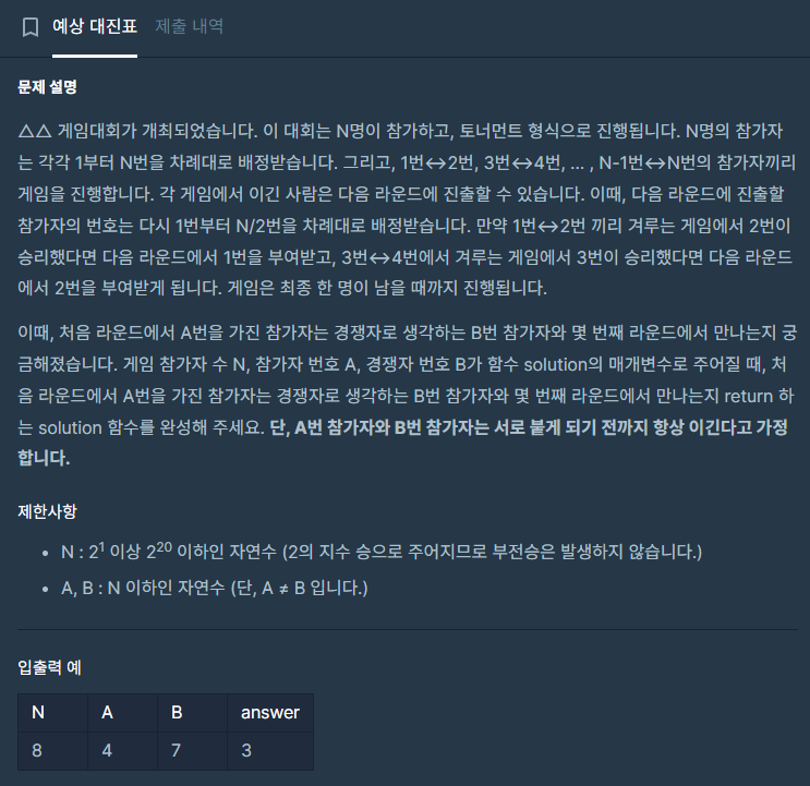 public int solution(int n, int a, int b)