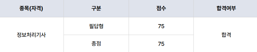 코딩 문제 꾸준히 푸는 사람이라면 함정 문제 몇 개 제외하면 다 맞추기 가능하니 걱정안해도 된다. 나는 필기는 80점, 실기에서 개념 3개, 코드 2개 틀려 75점이 나왔다. 고득점을 못받은게 아쉬울따름이다.