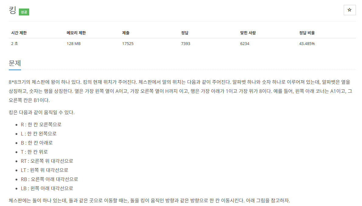 static int[] dx = {1, -1, 0, 0, 1, -1, 1, -1}; static int[] dy = {0, 0, -1, 1, 1, 1, -1, -1}; {"R", "L", "B", "T", "RT", "LT", "RB", "LB"};각 커맨드의 좌표를 문제에 나와있는 순서대로 나타낸 것이다. move 함수를 통해 킹의 위치와 돌의 위치를 옮긴다.