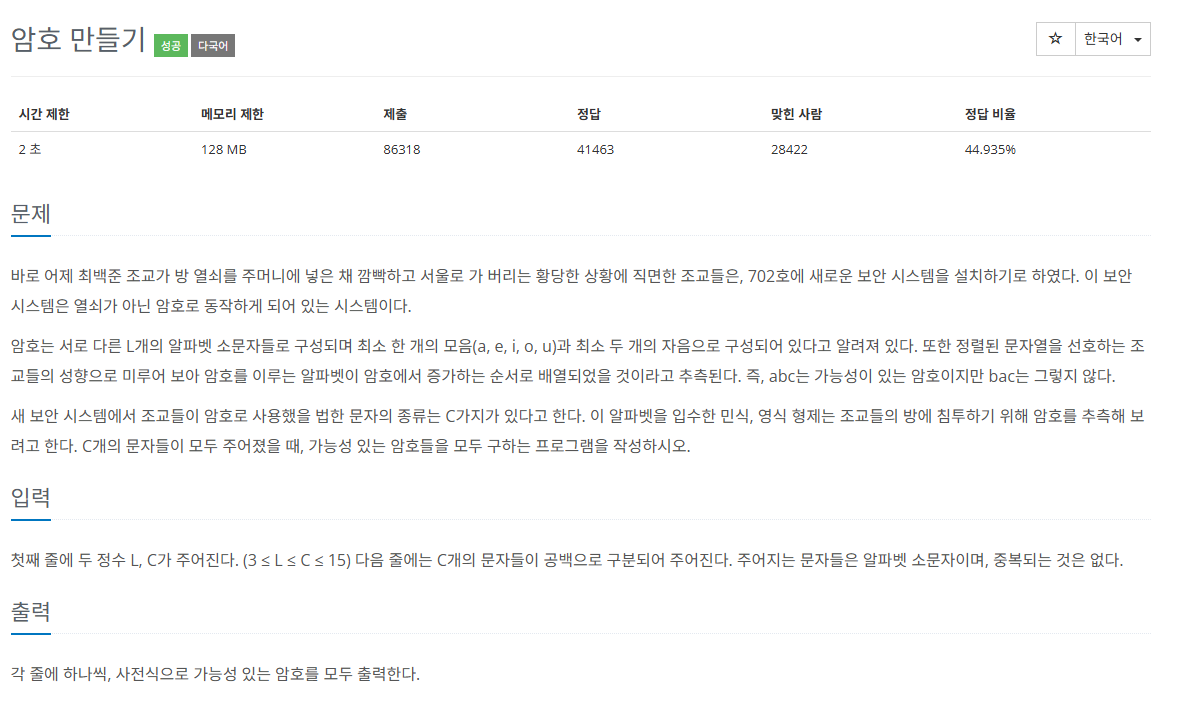 백트래킹을 사용하여 가능한 암호를 생성할 때 각 문자가 모음인지 자음인지 판별하며 모음과 자음의 개수를 각각 세었다.