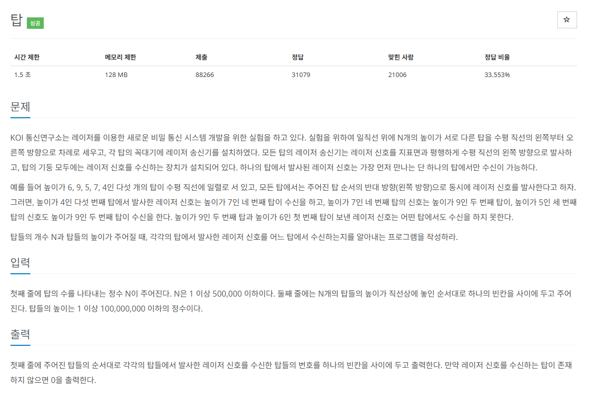 처음에는 Stack을 사용하지않고 풀어 시간초과가 났다. Stack을 사용하면 stack.peek()[0] → 탑의 높이, stack.peek()[1] → 탑의 인덱스(탑 번호)를 저장할 수 있어 시간초과 나지않게 문제를 풀 수 있다.