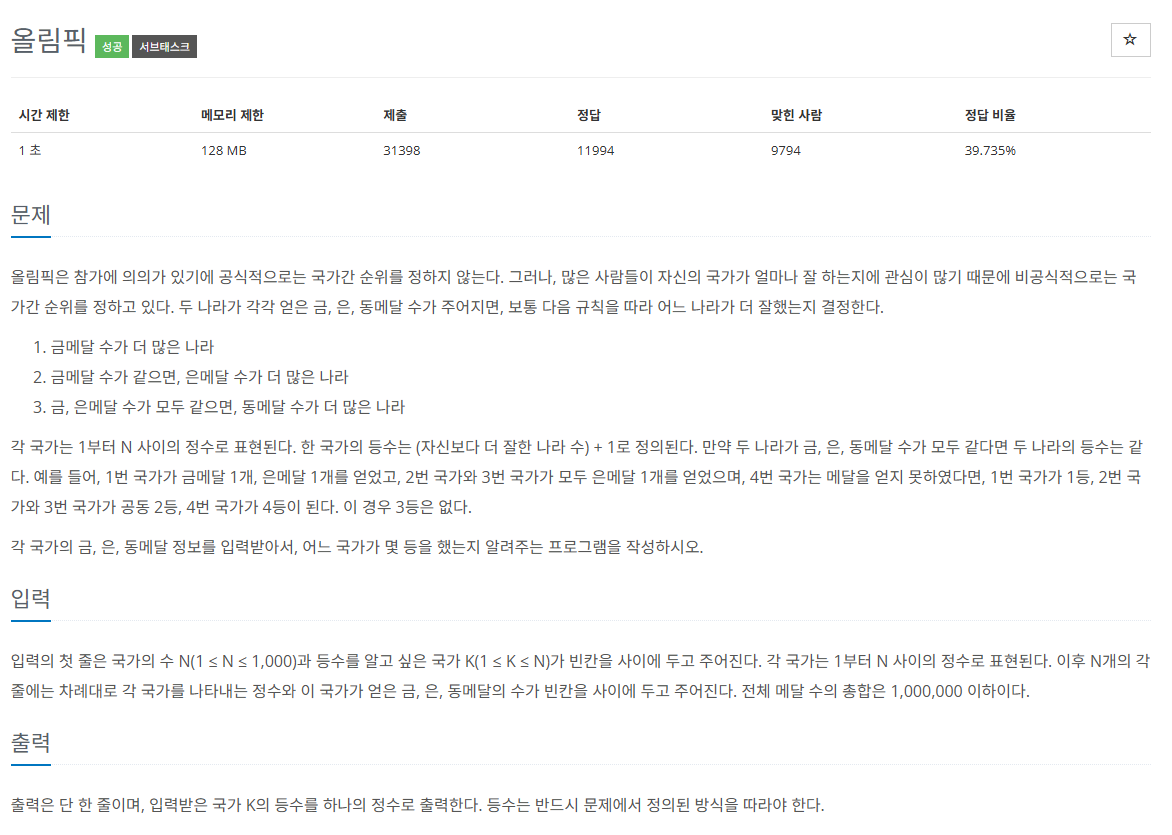 Comparator 정렬을 통해 풀 수 있는 문제이다. 한 가지 함정이 있는데 순위가 동일할 경우 랭크를 유지해야 된다는 것이다.