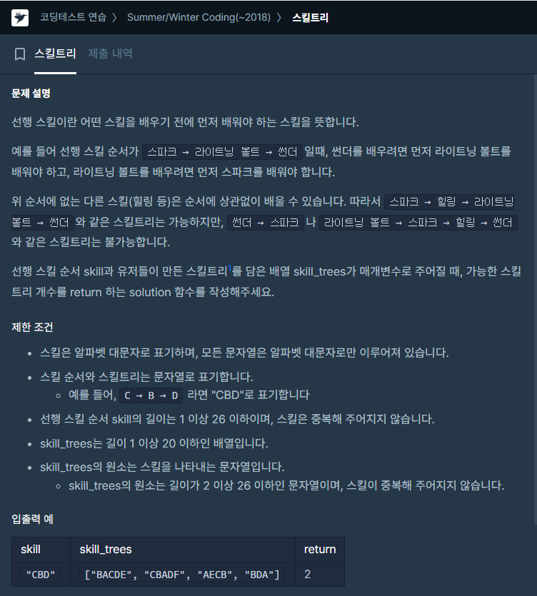먼저 skill.indexOf(c)를 사용하여, 현재 문자 c가 선행 스킬 목록인 skill에 포함되어 있는지를 확인하였다.