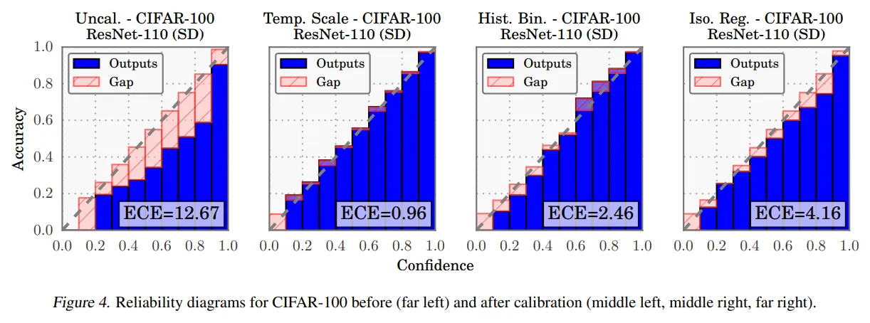 - Figure 4는 CIFAR-100를 학습한 110-layer ResNet의 calibration 전후 reliability diagram을 나타낸 것이다.