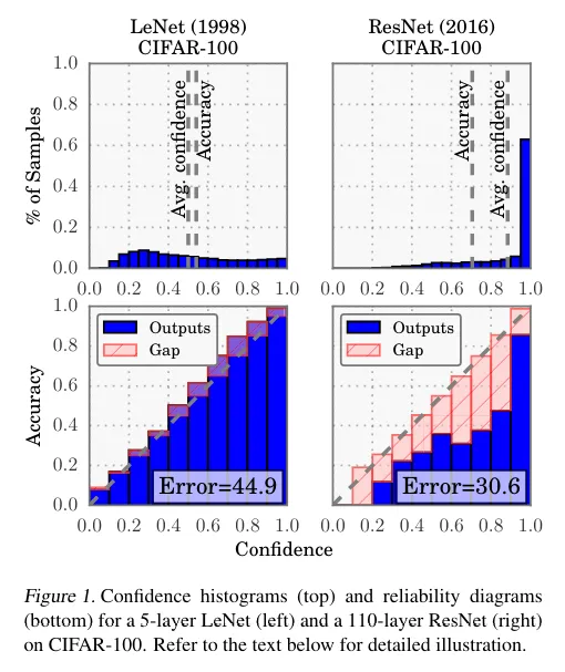 - LeNet의 평균 confidence는 거의 accuracy와 일치하는데, ResNet의 평균 confidence는 accuracy를 훌쩍 뛰어넘는다.