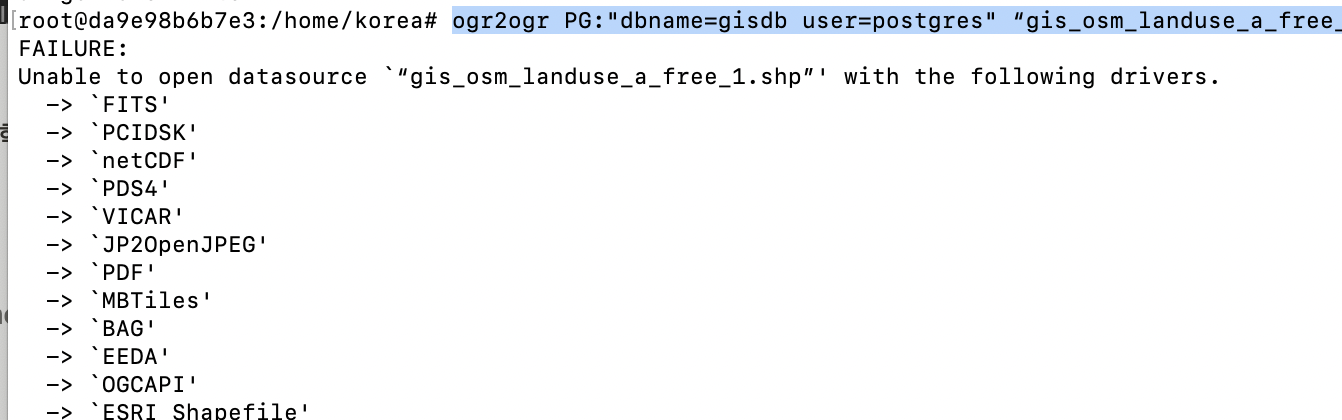 ex) ogr2ogr PG:"dbname=gisdb user=postgres" “gis_osm_landuse_a_free_1.shp” -nln south_korea.landuse -overwrite