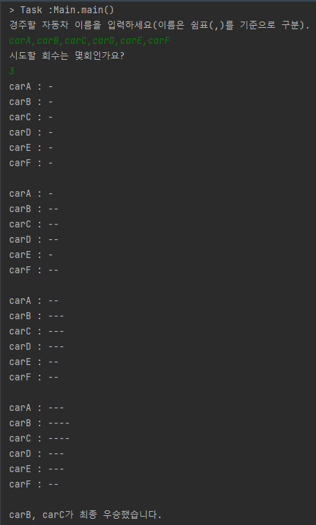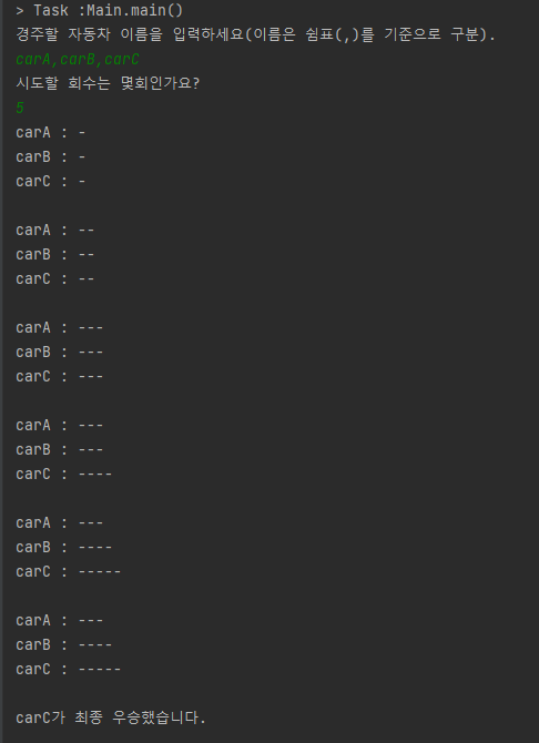5.자동차 경주 게임을 완료한 후 누가 우승했는지를 알려준다. 우승자는 한명 이상일 수 있다.
