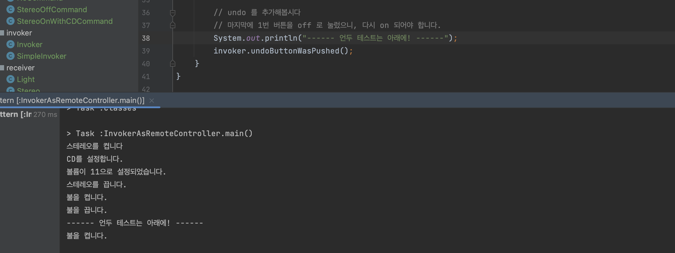 이 커맨드 객체는 리시버에 전달할 일련의 행동으로 구성됩니다!