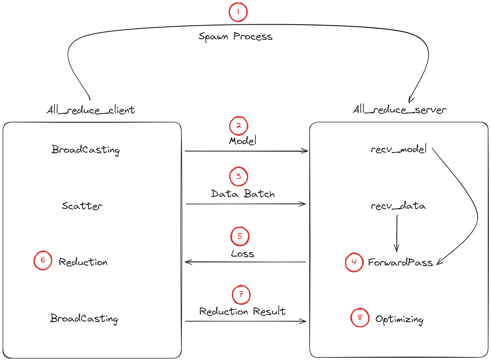 실제로는 all_reduce_client 파트에서도 forward pass가 일어나지만, 이해를 돕기 위해 reduction 연산안에 포함되어 있는 걸로 간주하면 좋을 것 같다.