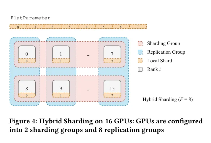위의 예시 그림에서와 같이 하이브리드 샤딩은 샤딩과 복제를 사용합니다. 샤드는 샤드의 그룹을 라고 할 때, 의 크기로 분배됩니다. 위의 그림에서 local shard 내부의 노란색 아랫칸에 주어진 0…7까지의 번호가 샤드 그룹의 Rank입니다. 생성된 샤드 그룹 내부적으로 파라미터를 복제하여 생성된 복제 그룹이 생기게 됩니다. 복제 그룹에 생기게 되는 rank는 로컬 샤드의 중앙에 있는 번호입니다.