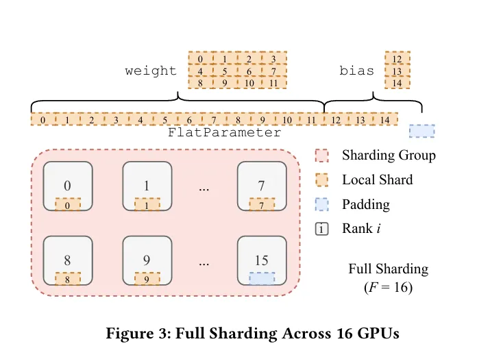 사용되는 메모리가 제일 적고 통신 부담은 제일 큰 방식의 샤딩입니다. 다시 인용한 위의 그림에서 볼 수 있다시피, input size가 모두 EVEN 합니다. 이 때 even한 사이즈를 맞추기 위해 패딩이 사용됩니다. EVEN한 사이즈는 CUDA의 NCCL 라이브러리에서 통신 시 가해지는 부담을 최소화하기 위함입니다. 더불어서, 이 때 최대한 GPU의 Vram 가용한 선 내에서 최대한 커다란 양의 배치 사이즈를 가져야 통신에 발생하는 부담을 줄일 수가 있습니다. 이유는 위와 마찬가지입니.