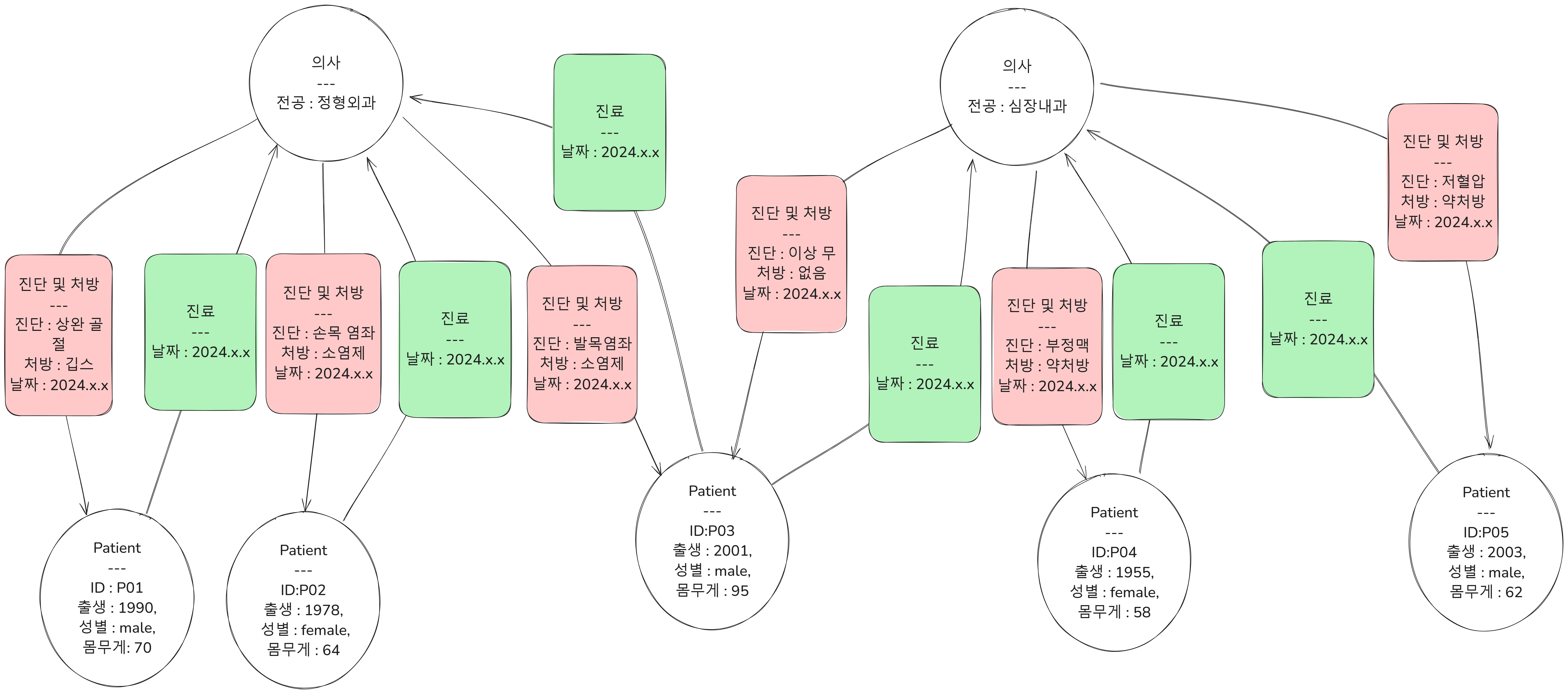 일반적인 그래프의 예시를 들어보자. 아래는 병원에 내원한 환자와 처방, 그리고 진료 받은 의사의 관계를 나타낸 그래프다. 아래의 그래프 역시 많은 걸 보여주지만, 아래의 그래프를 설명하는 추가적인 설명이나 매뉴얼 없이는 아래의 그래프를 이해할 수 없다.