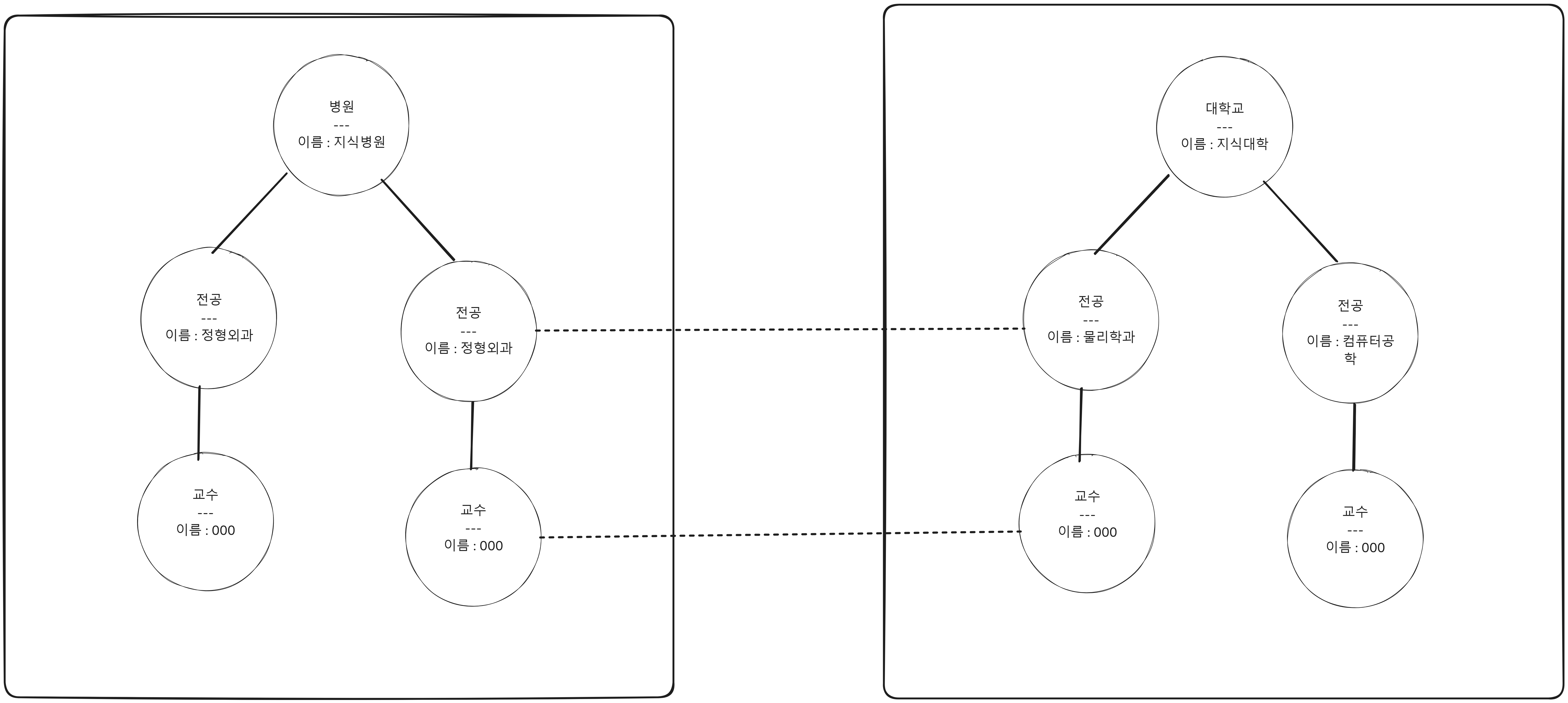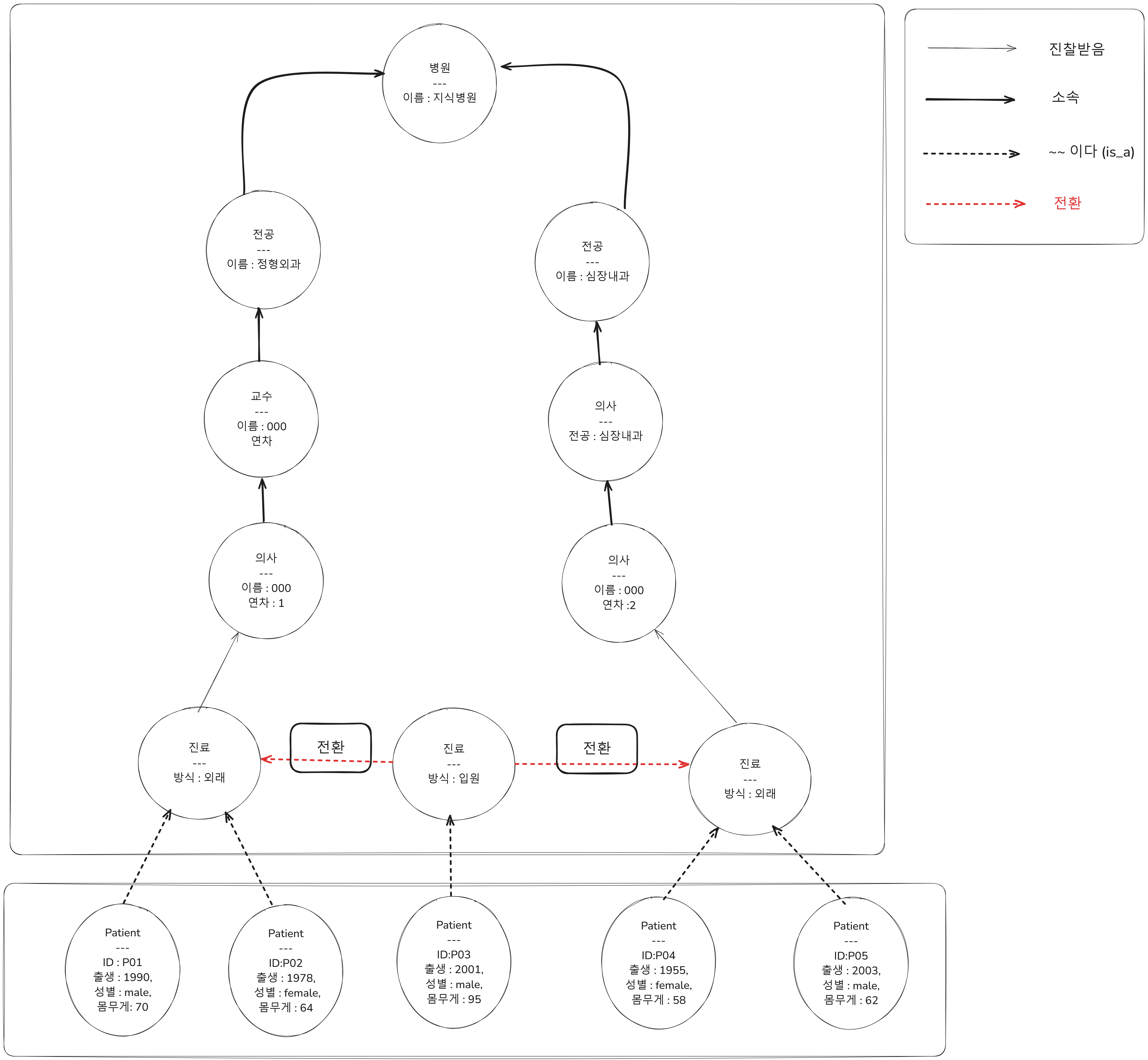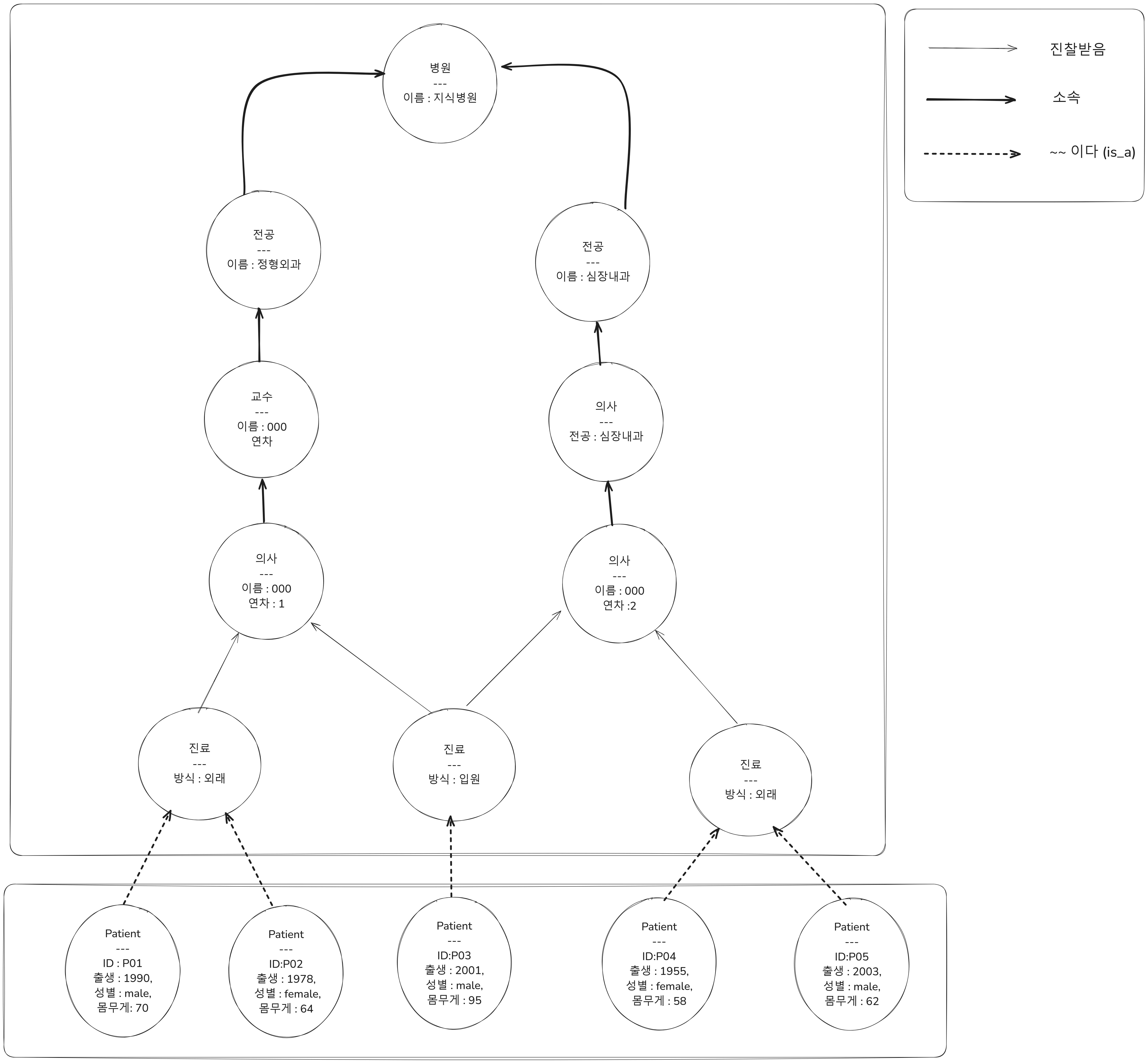 위의 그래프는 좀 더 병원이라는 카테고리의 내부의 위계와 구조가 잘 표현되어 있다. 즉, 각 분과에 배정된 사람과 책임 관계 역시 파악할 수 있으며 추가적으로, 환자의 진료 방식과 환자를 케어하는 분과가 어디인지도 알 수 있다. 물론 갑자기 가운데 환자의 상태가 심각해진 것 같은 건 기분 탓이다.