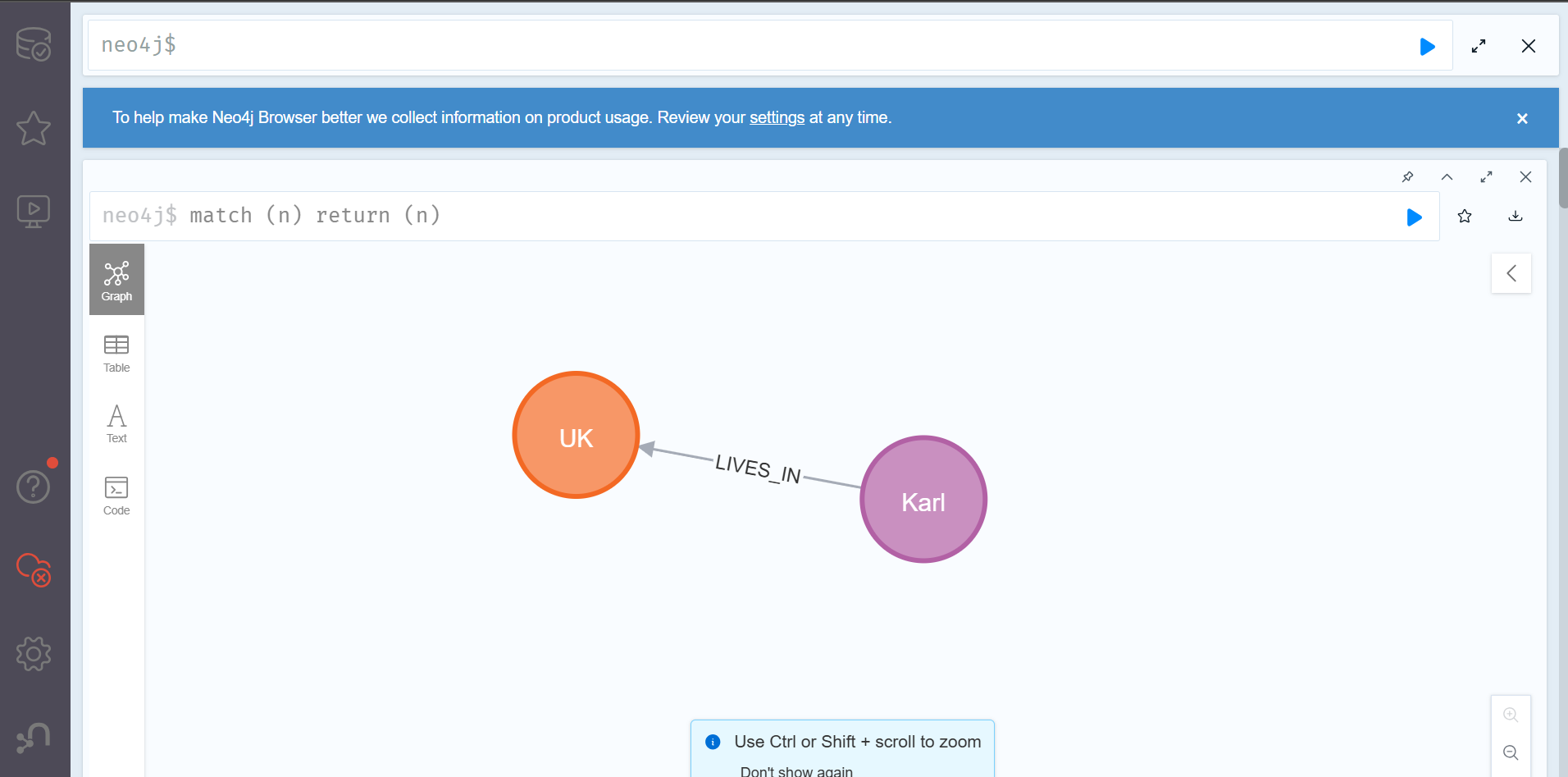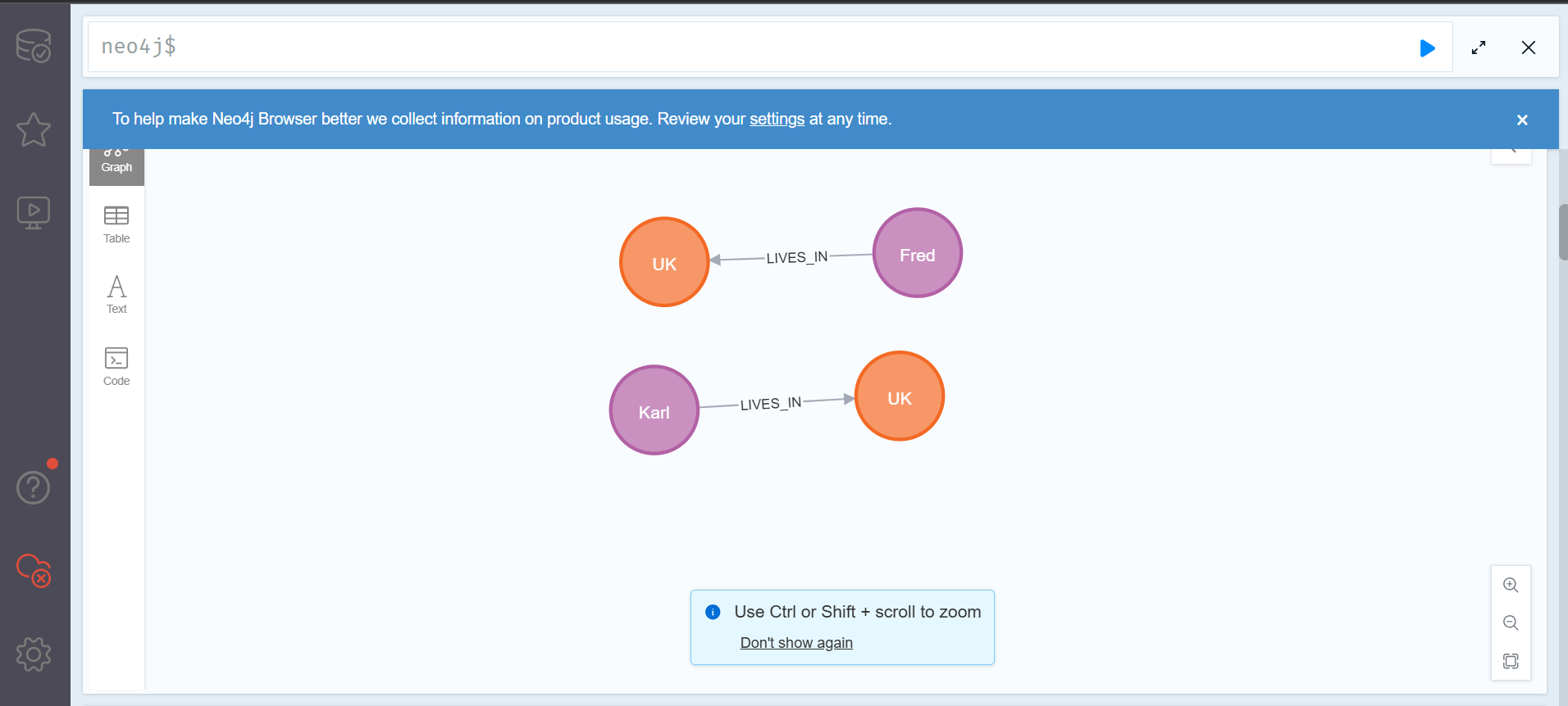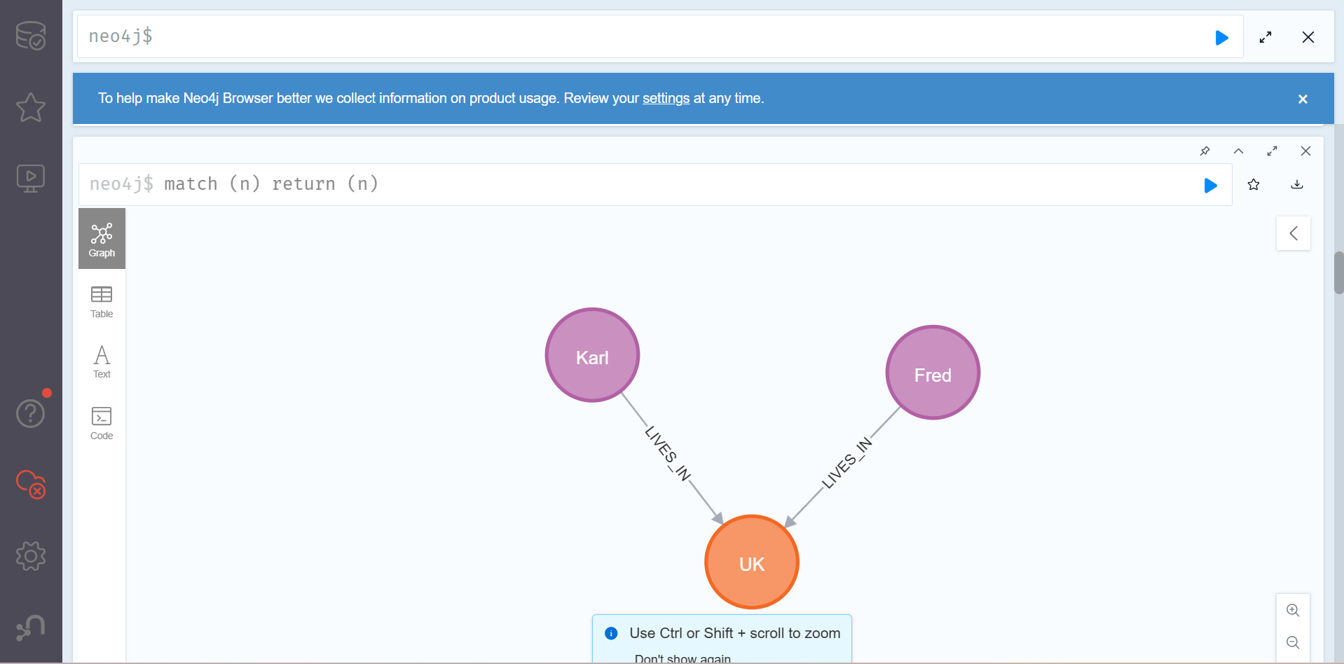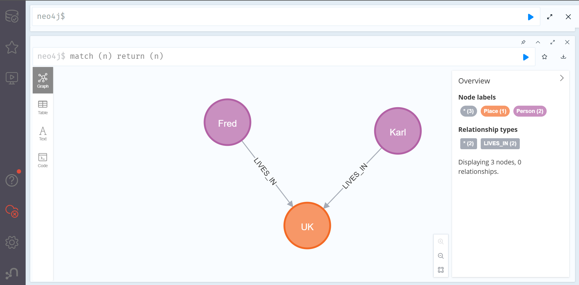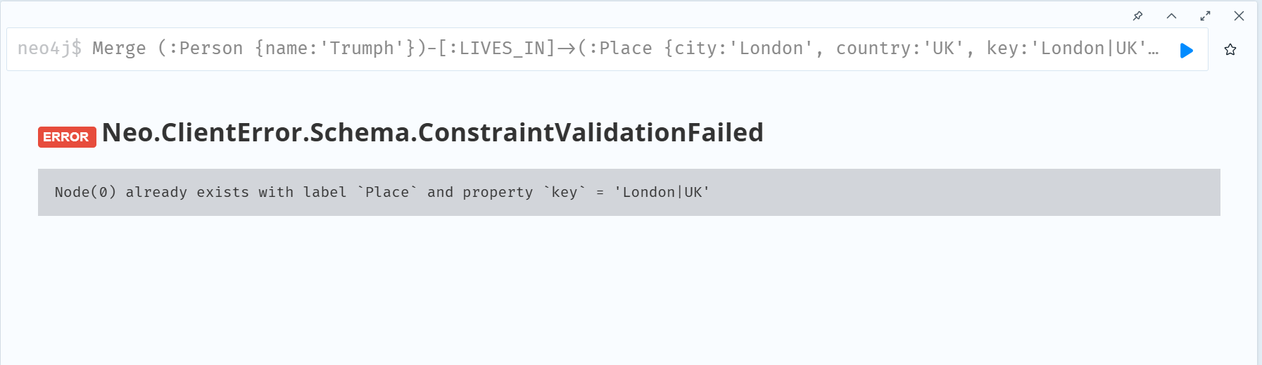 여기서 새로운 사람노드가 LIVES_IN 관계를 통해 기존에 존재하는 london 노드와 연결되리라는 것을 기대할 것이다. 하지만 쿼리를 실행시키면 다음과 같은 결과를 얻게 될 것이다.