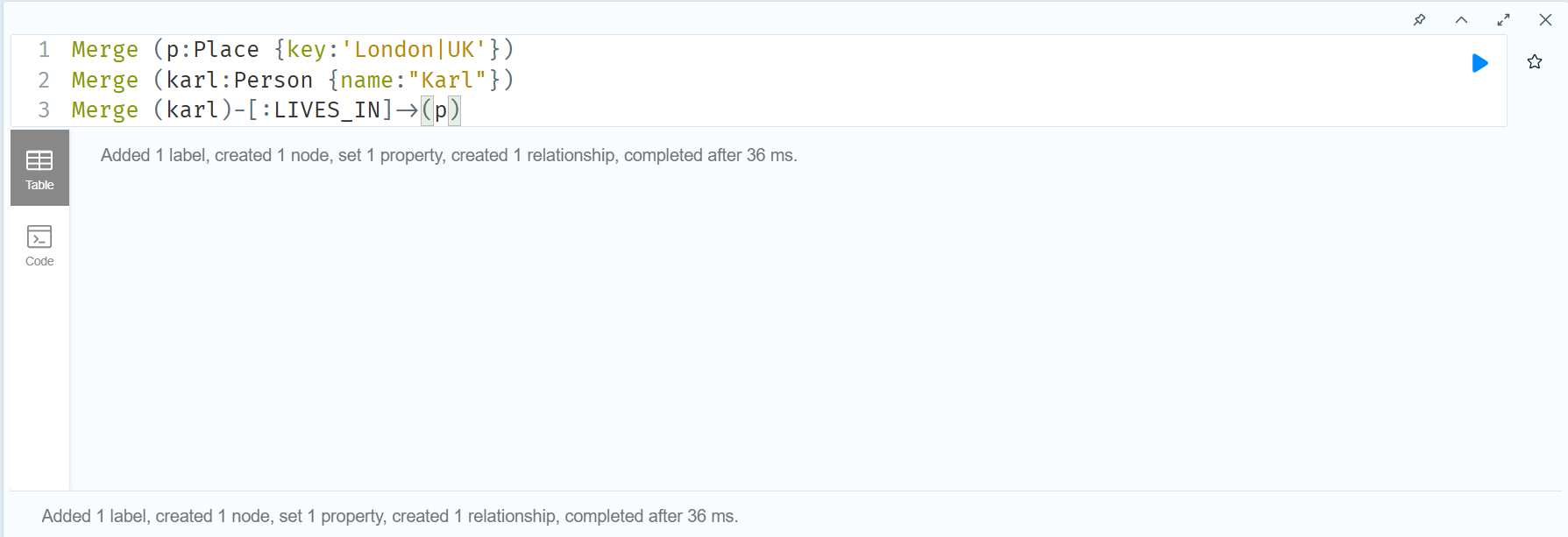 MERGE (:Person {name:'Karl', age:64})-[:LIVES_IN {since:1980}]→(:Place {city:'London', country:'UK'})