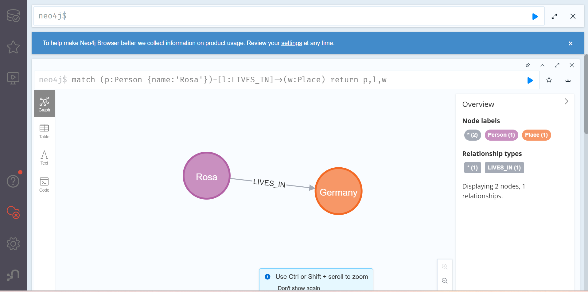 생성 명령문인 Create의 뒤에 넣고자 하는 데이터의 패턴 - (:Person {name:'Rosa'})-[:LIVES_IN {since:2020}]-> (:Place {city:'Berlin', country:'DE'}) - 이 뒤따르는 것을 확인할 수 있다.