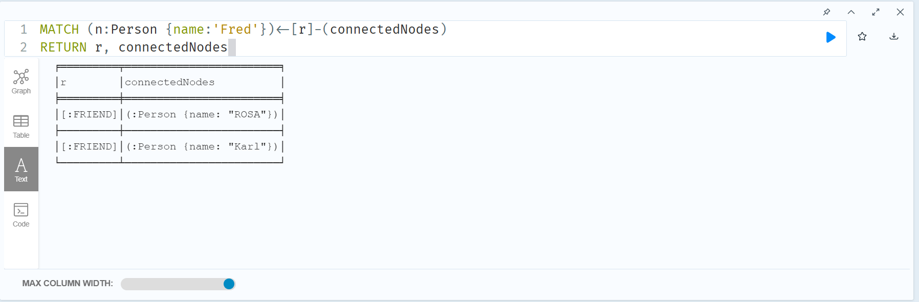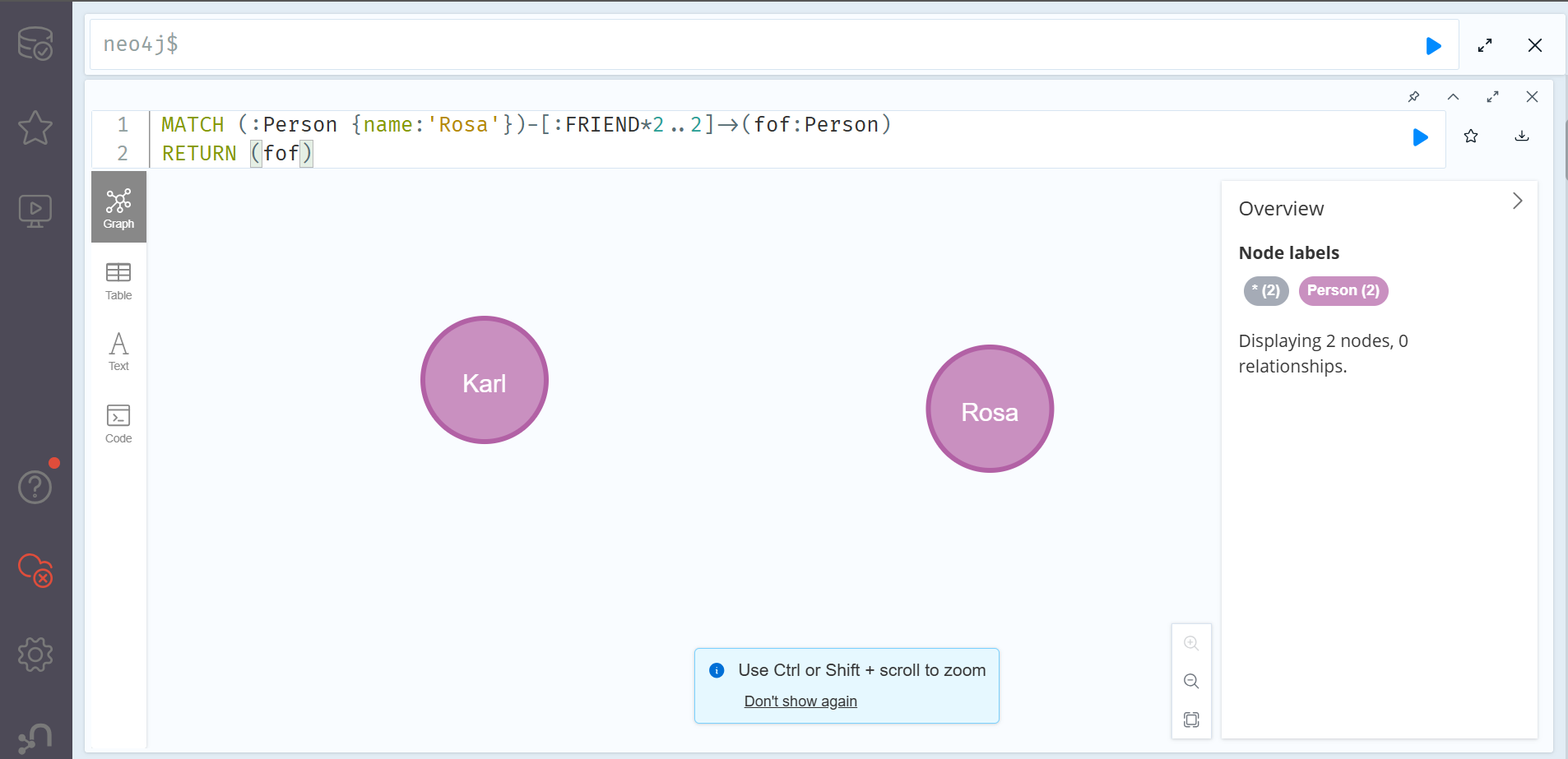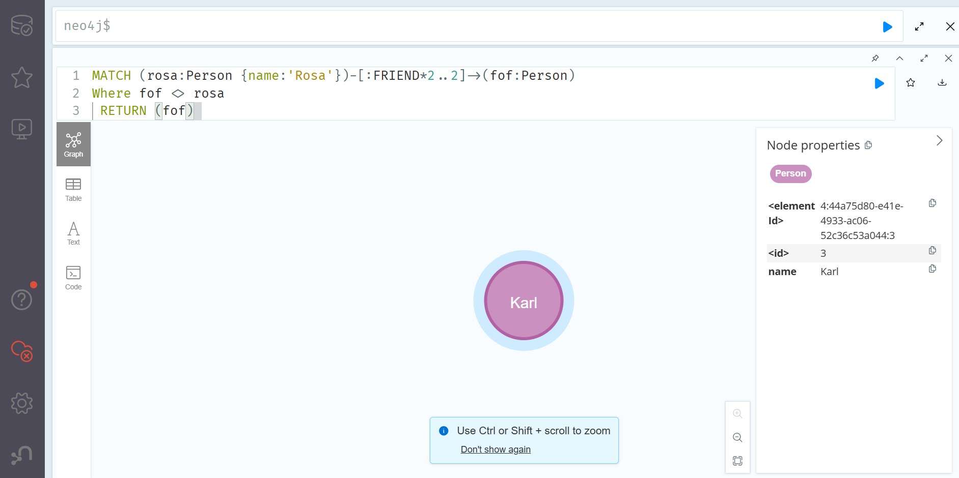 Rosa와 친구인 Fred 역시 Rosa와 친구관계로 이어져 있으므로, Rosa 역시 반환되는 것을 알 수 있다. 이 때 간단하게 where문을 추가한다면 Rosa가 반환되는 것을 방지할 수 있다