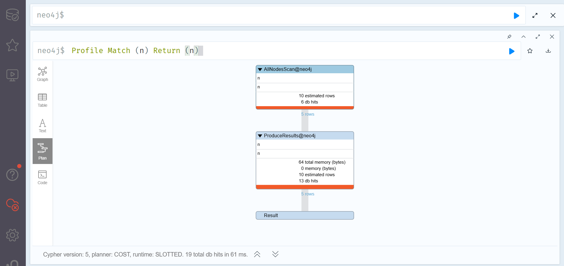 PROFILE의 경우는 Explain보다 좀 더 상세한 내용을 알려준다. PROFILE 구문은 실제의 쿼리가 실제 지식 그래프 어떻게 동작하는지 등을 시각화하여 사용자가 좀 더 실제 쿼리 동작에 대한 자세한 피드백을 받을 수 있도록 한다.