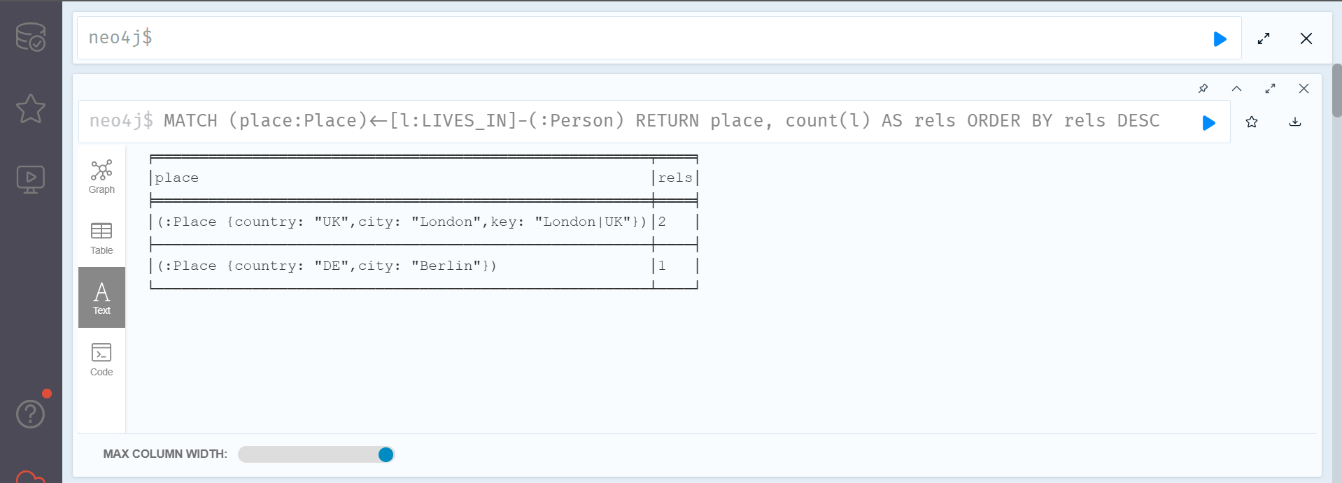 RETURN place, count(l) AS rels ORDER BY rels DESC