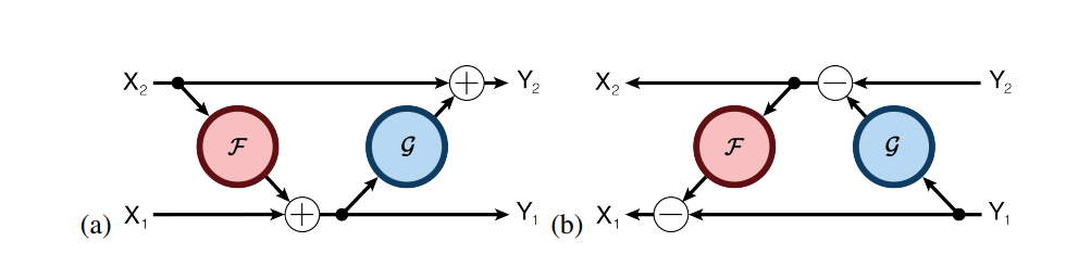 위의 식은 Residual Block과 상당히 유사하지만, 바로 input 값을 복원하기 위해 연산을 바로 적용하여 Back Computation이 가능하다는 장점이 있다. 따라서, Residual Block 처럼 중간 결과를 저장할 필요가 없게 된다.
