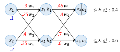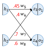 은닉층 출력값 h1,h2에 해당 가중치 w를 곱하고 합산하여 z3,z4 계산