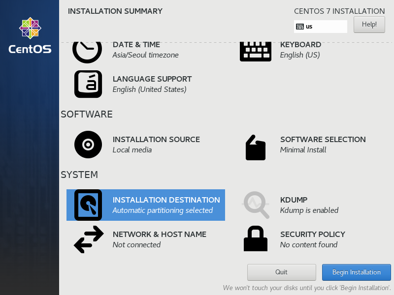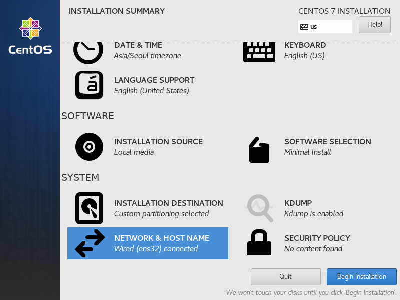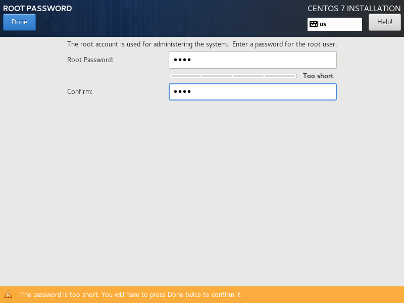 root 계정의 패스워드 설정은 필수이며, 설정하지 않을 경우 CentOS 설치가 최종 마무리되지 않는다.